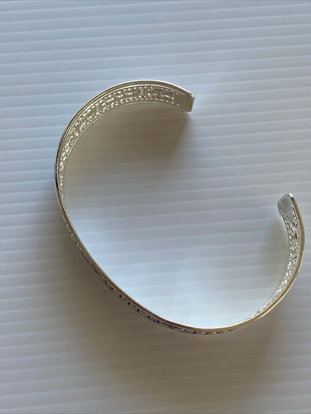 This stunning Silver Plate embossed Detail open Cuff Bangle with Light Blue Backing is a perfect gift for any special occasion.