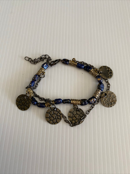 - Bronze tone textured Coin Charms and fine link chain finishes off Bracelet.