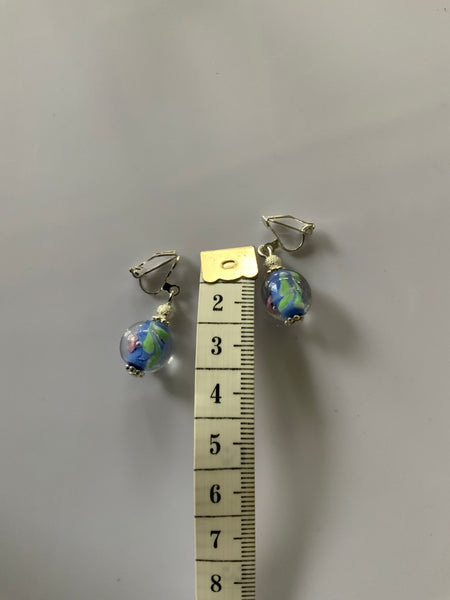 Lampwork Blue & Green Floral Dangle Earrings Silver Plate Clip-On only