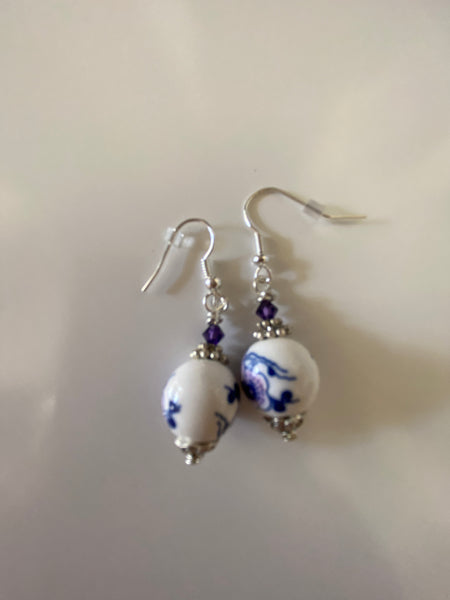 These Handcrafted earrings consist of a Ceramic Handpainted 12mm bead. As these are hand painted no 2 beads are identical, but closest in look has been used, to make up the pair. A gorgeous 4mm Swarovski Crystal in Velvet Purple, along with silverplate findings have been used to complete the look.