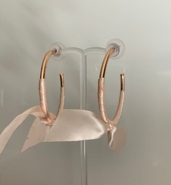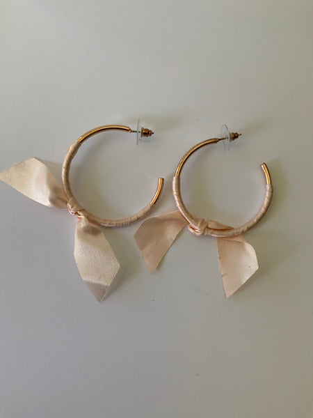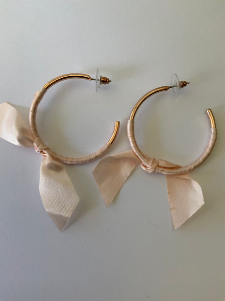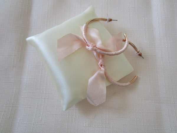 Large Open Ended Gold Plated Hoop with Very Pale Pink Ribbon Bow Dangle Earrings