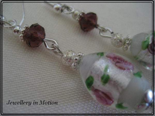 The Silver Foil Oval White Beads with a floating Pink Flower and shiny Silver Backing. The deep Purple Crystal Rondelles and Shiny Silver Stardust beads, finish off these Earrings.