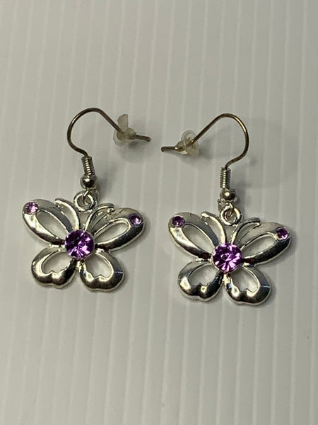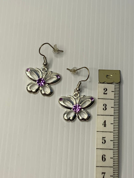 Silver Plate Butterfly Charm Earrings Purple Rhinestone Features - Pierced Ears
