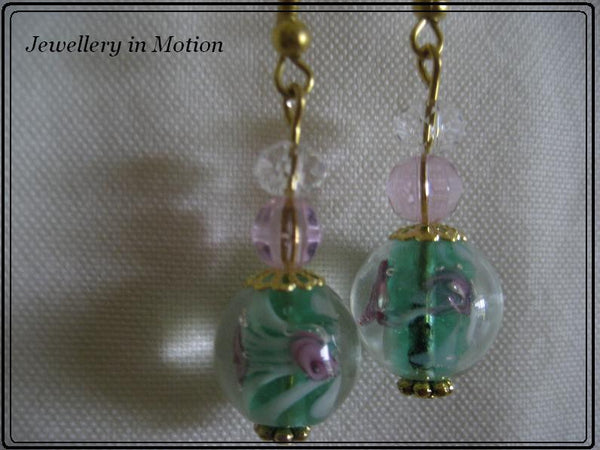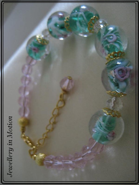 detailed in shades of Green with White Swirl and Pink Flowers, floating thru