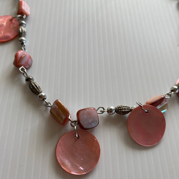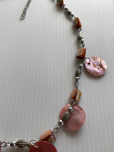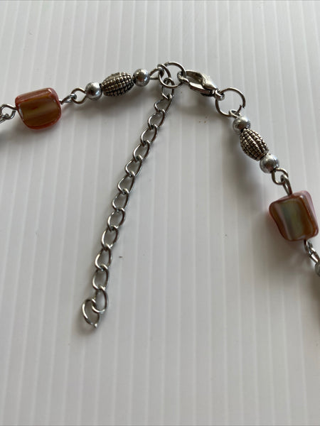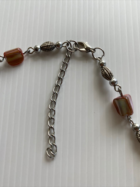 Silver Tone Beaded Link Short Necklace with Pink Peach/ Coral Colour Feature Beads.