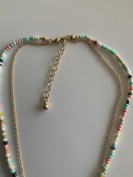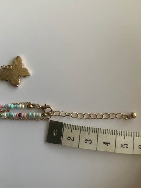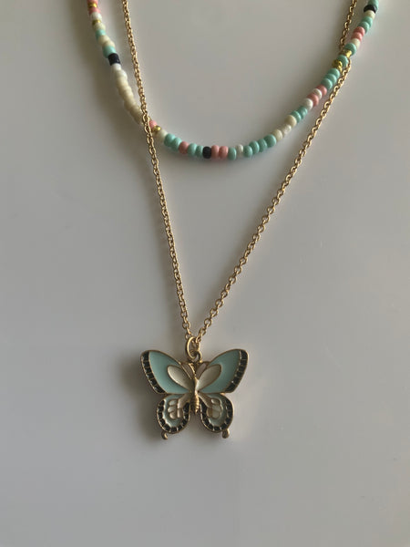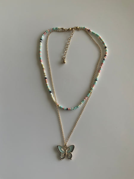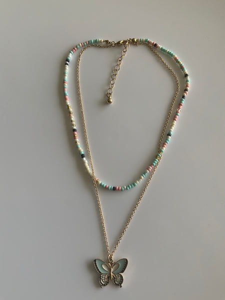 Double Strand pastel coloured Beaded Necklace Choker & Chain with Butterfly Charm.
