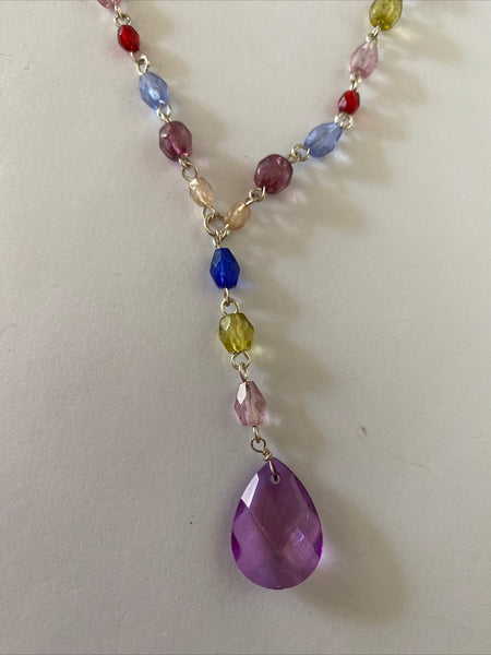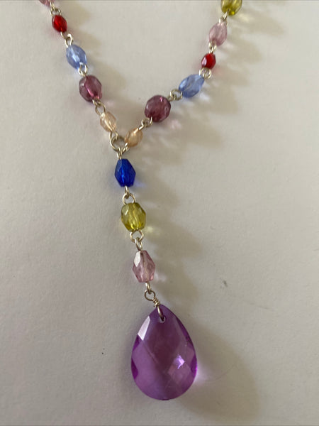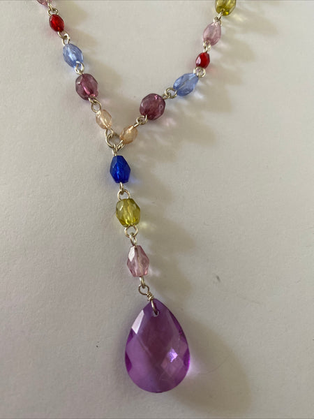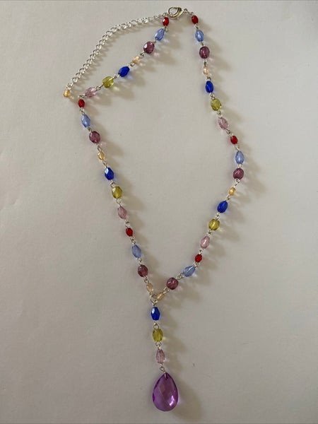 Colourful Silver Plate Y Necklace Faceted Purple Teardrop Pendant Adjustable