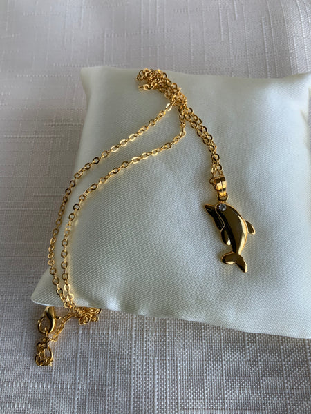 Dolphin Charm with Rhinestone Eye in Gold Plated Necklace Chain 42 cm