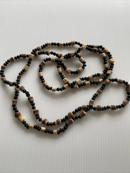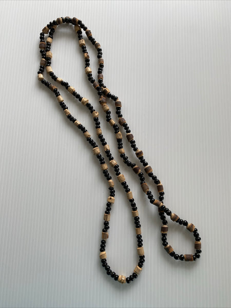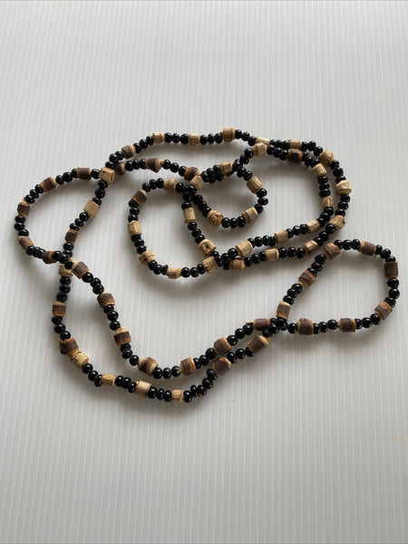 Long Strand part wooden Brown & Black Bead Necklace slide over No Clasp