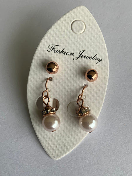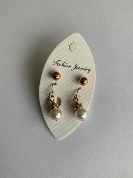 Duo Set Rose Gold Plated Stud and Rose Gold Plate Round Pearl & Rhinestone Drop Earring Set