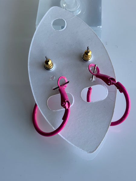 Set of 2 Hot Pink Hoop and Round Stud Pierced Earrings.