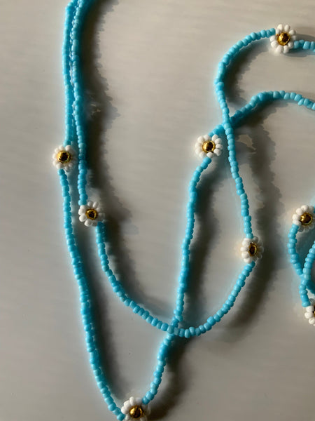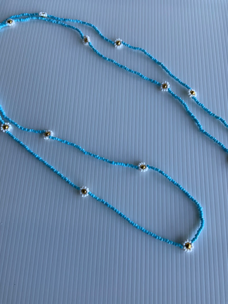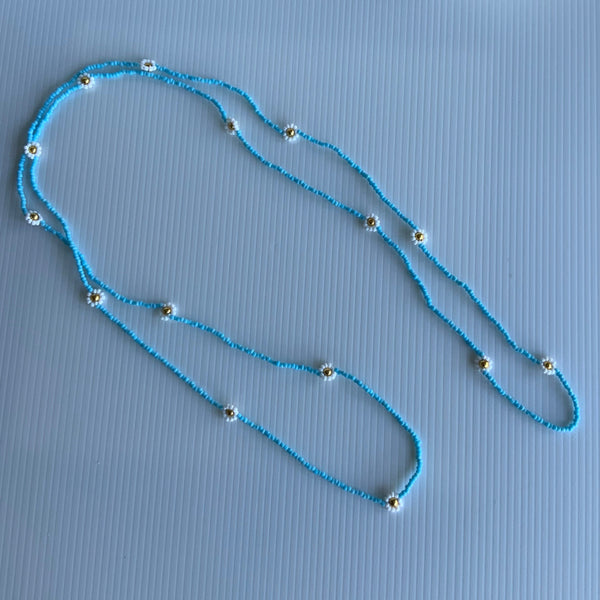 Long blue and White Bead Daisy Necklace slide over Long Blue Necklace