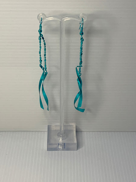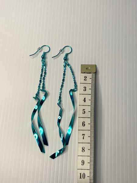 Long Wavey Ribbon Like & Ball Chain Metal Earrings Blue Pierced Hooks